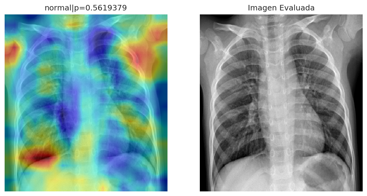 The zonal analysis shown, which areas from the image, where used to carry on the diagnosis. This represent the zones where the algorithm detect pneumonia or a normal state. The cold colors, represent the zones, which have a probability of having a normal state, whereas the warm colors represent the probability of pneumonia in such zones. This information is intended to bring support as evidence about the diagnosis. Since this application is under development, some zones mark areas out of the main image. This will be improved in the next iterations. To see the analysis in more detail, click on the image to zoom in.