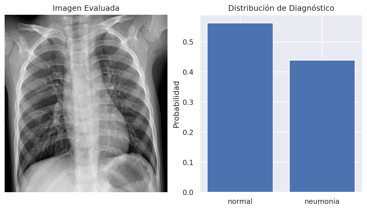 The diagnosis discards the presence of pneumonia in the patient. From the analysis, the patient present a normal state, with a 56.19% of confidence. Whereas the probability of having pneumonia is: 43.81%. The distribution for both states can be observed in the plot.