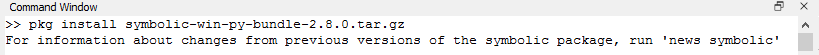 Now on the command window type the following command: pkg install symbolic-win-py-bundle-2.8.0.tar.gz. Wait until the installation process finish.