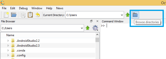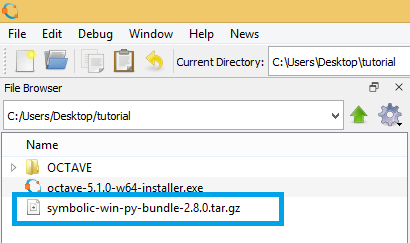 Once GNU Octave is installed, we need to install the Symbolic package. This package will allow us to perform symbolic calculations. These include operations such as: algebraic operations, calculus, equation solving, Fourier and Laplace transforms, variable precision arithmetic and other features. First download the package here. Open octave, and change the directory path to where the file is. For that, go to the upper bar and select Browse directories. This will open a window explorer, navigate to where you downloaded the symbolic package. Then, click on Select Folder (if the file is not displayed, don’t worry). You must now see the file on the left explorer, if not, make sure you selected the folder where the file is located.